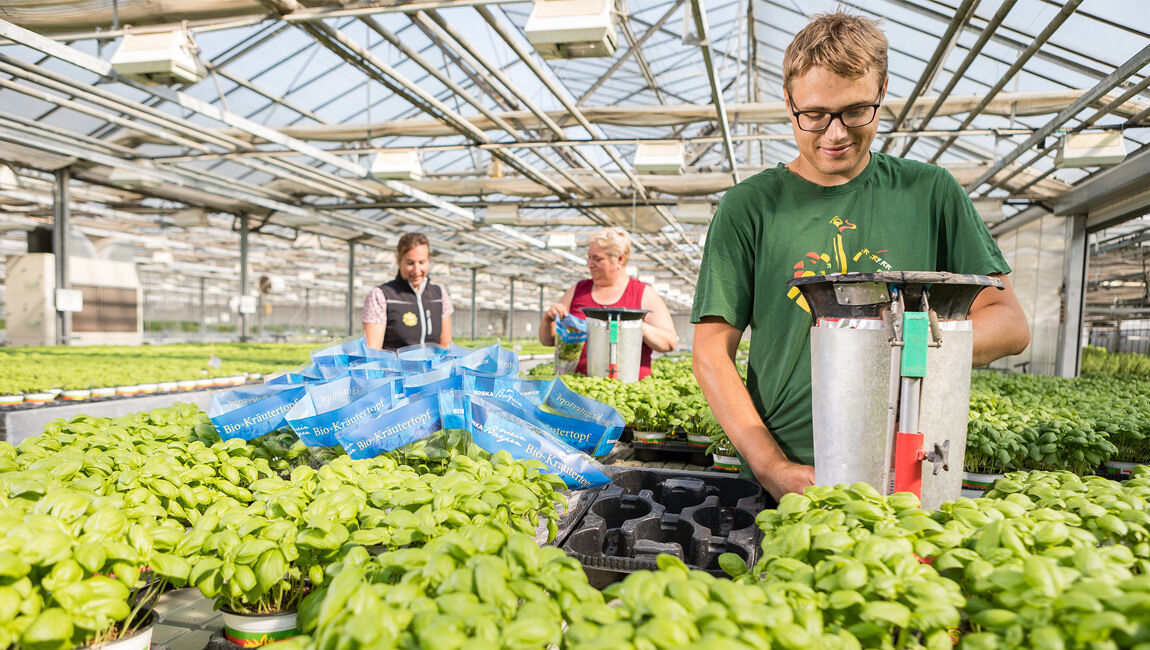 Produziert wird auf 11 ha Gewächshausfläche und 80 ha Freiland. Und das das ganze Jahr hindurch. Rund 80 festangestellte Mitarbeiter und weitere 60 Saisonkräfte kümmern sich liebevoll um die Aufzucht und Ernte der Kräuter und Gemüse. Der Absatzmarkt liegt im Umkreis von 150 km rund um den Betrieb. Die Transportwege sind somit vergleichsweise kurz. Von der Ernte bis zum Eintreffen beim Kunden ist die Zeitspanne oftmals weniger als 24 Stunden.