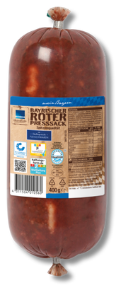 Unser roter Preßsack wird nach traditionellem Fleischerhandwerk hergestellt. Die Südbayerischen Fleischwaren verwenden zur Produktion nur bestes Fleisch von Schweinen hier aus der Region. Deshalb trägt unser roter Preßsack auch das Siegel „Geprüfte Qualität Bayern“ – damit Sie sicher sind, nur das Beste zu erhalten.
