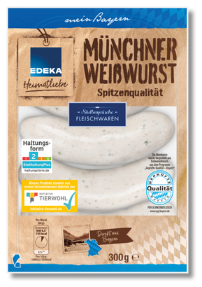 Unsere Münchner Weißwurst ist eine traditionelle Spezialität aus Bayern. Die Zutaten wie Schweinefleisch, -speck und -schwarte stammen von Züchtern hier aus der Region und tragen das Siegel „Geprüfte Qualität Bayern“ – wie eben auch unsere Weißwurst. Diese wird besonders schonend gebrüht, damit Sie den vollen Geschmack erleben.